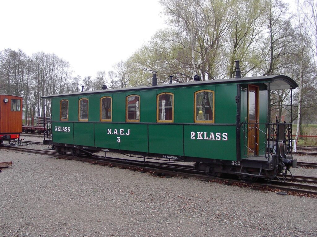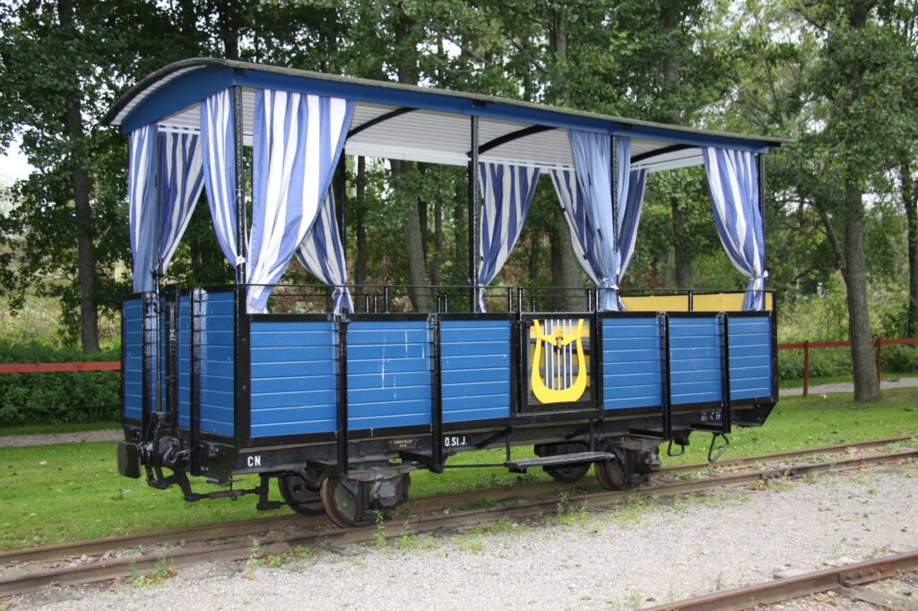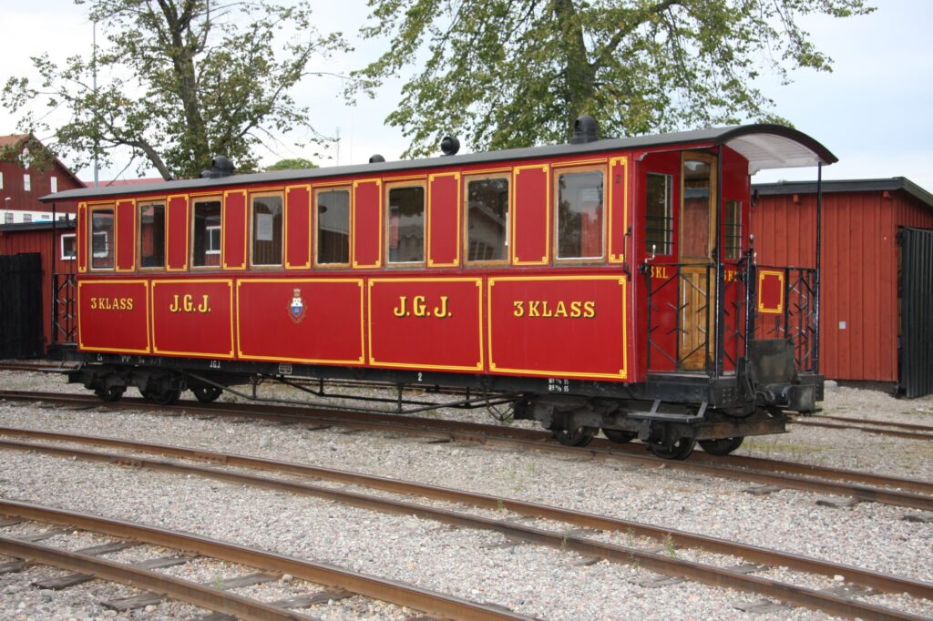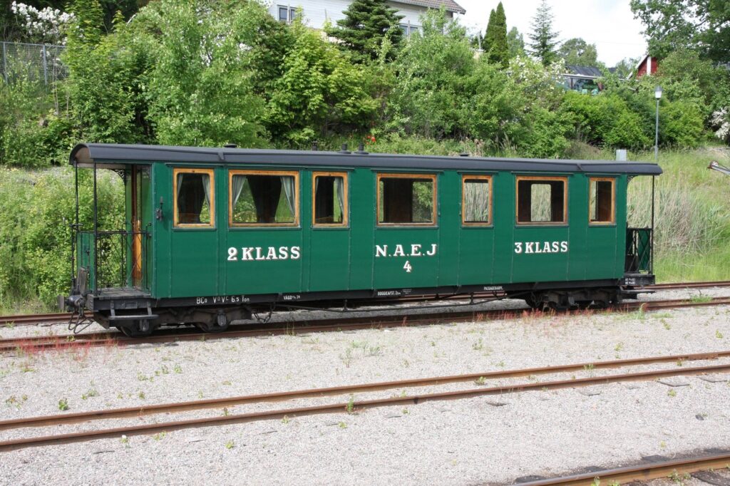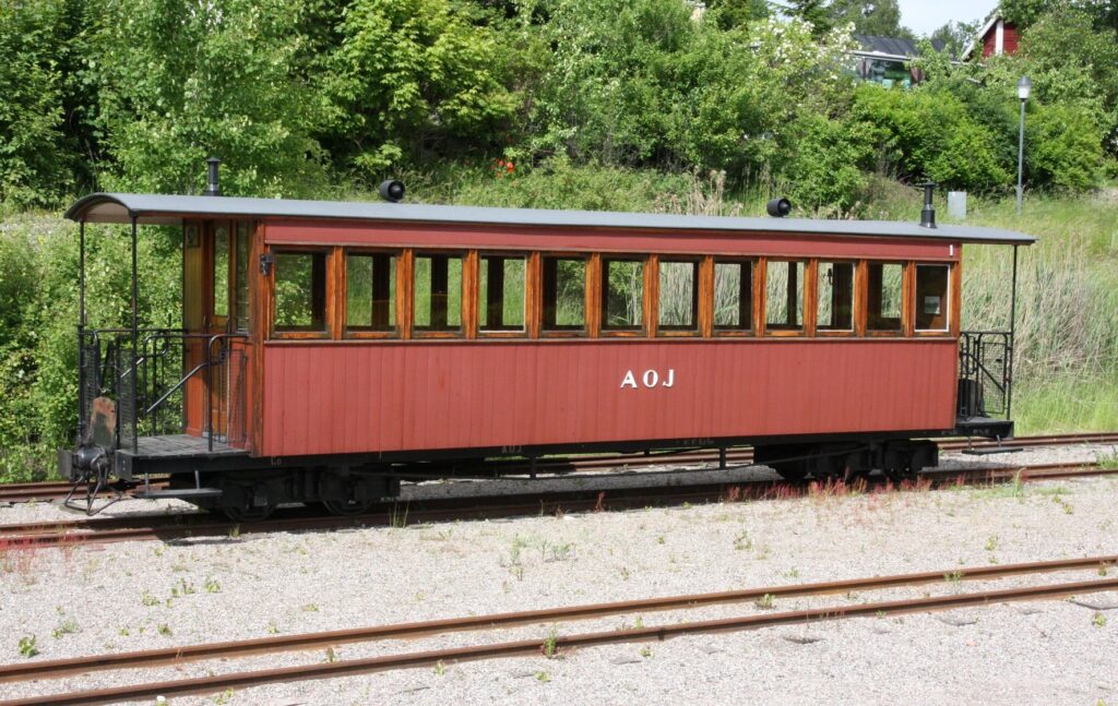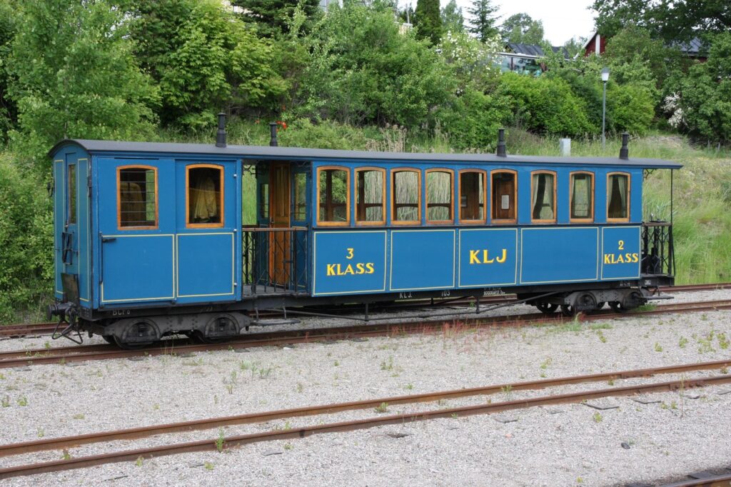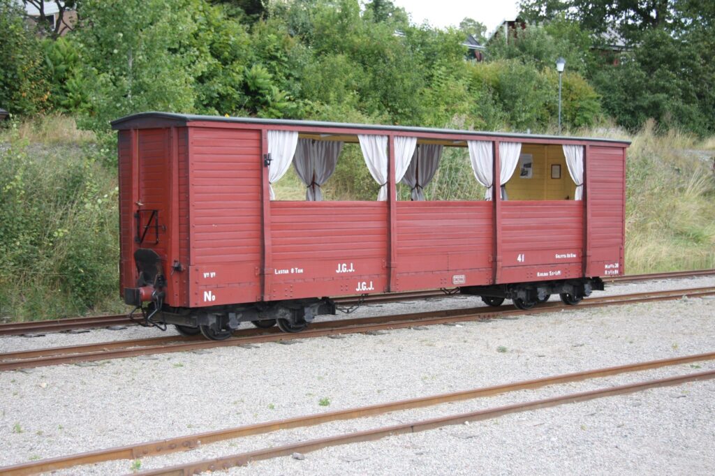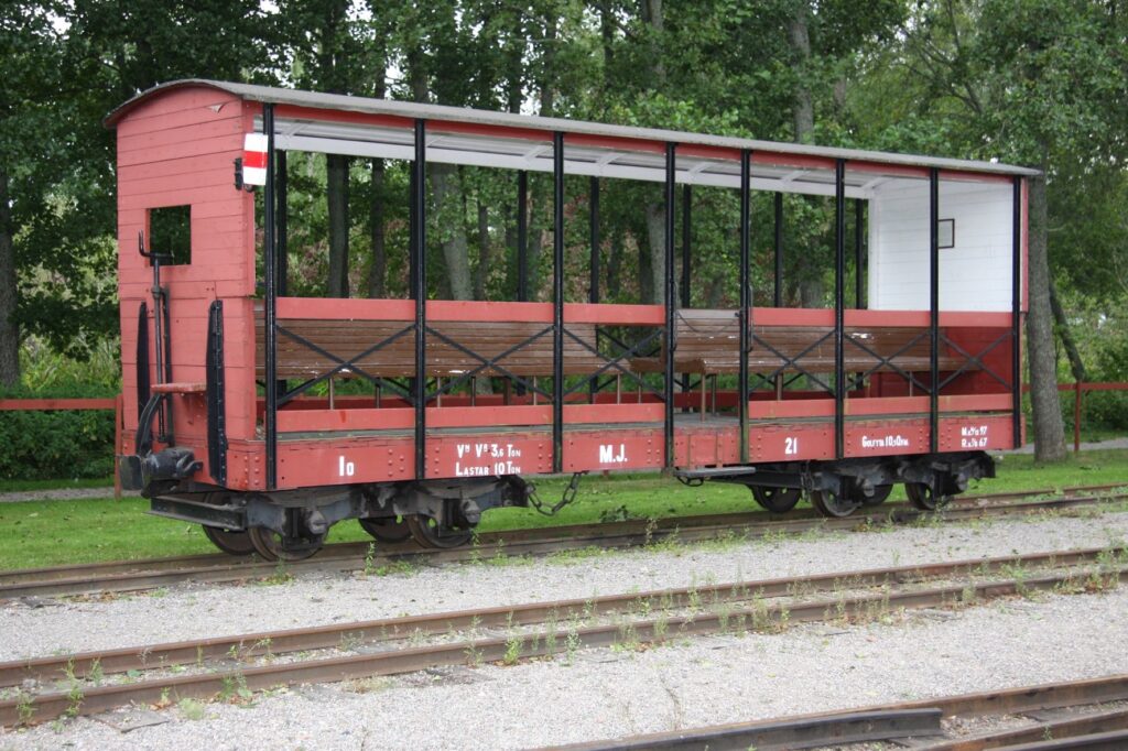This carriage is modeled after Decauville’s designs, but was made by the german company R. Dolberg in 1893. It originally had a compartment for freight that was repurposed as a ladies compartment in 1905. The outer sheet metal cladding was replaced by wooden panels in 1917. It was decommissioned by 1931 and was turned over to Sweden’s railway museum in 1948. It was brought to ÖSlJ in 1959 and was renovated in 1971 where it once again was given sheet metal cladding on the outside. It has since then been in service at ÖSlJ.