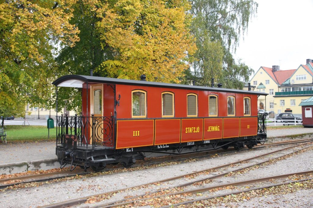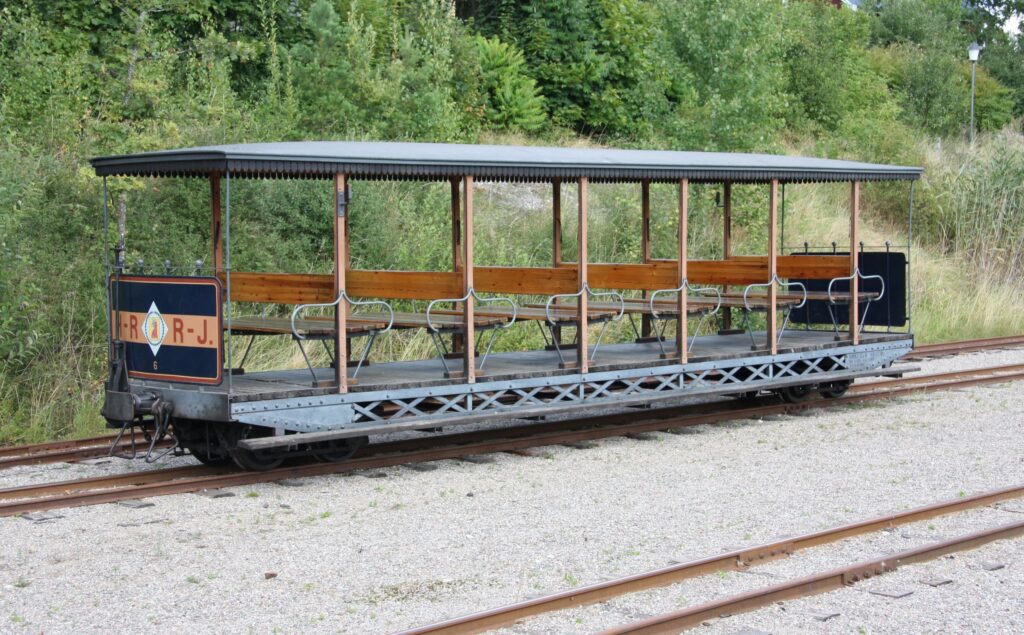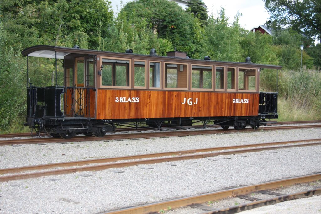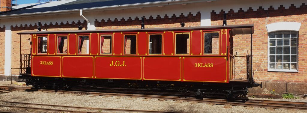 Kosta Foundry and Workshops originally built this carriage for HRRJ as a summer carriage modeled after Decauville’s designs, but it was soon retrofitted with windows along the whole length of the carriage. It arrived at JGJ in 1908 and was retrofitted several times, for instance in order to be compatible with the rail cars that JGJ built. It was sold to Aspa pulp mill in 1935 and from there came to ÖSlJ in 1959 where it entered service almost immediately. Following some renovations it’s still in use.