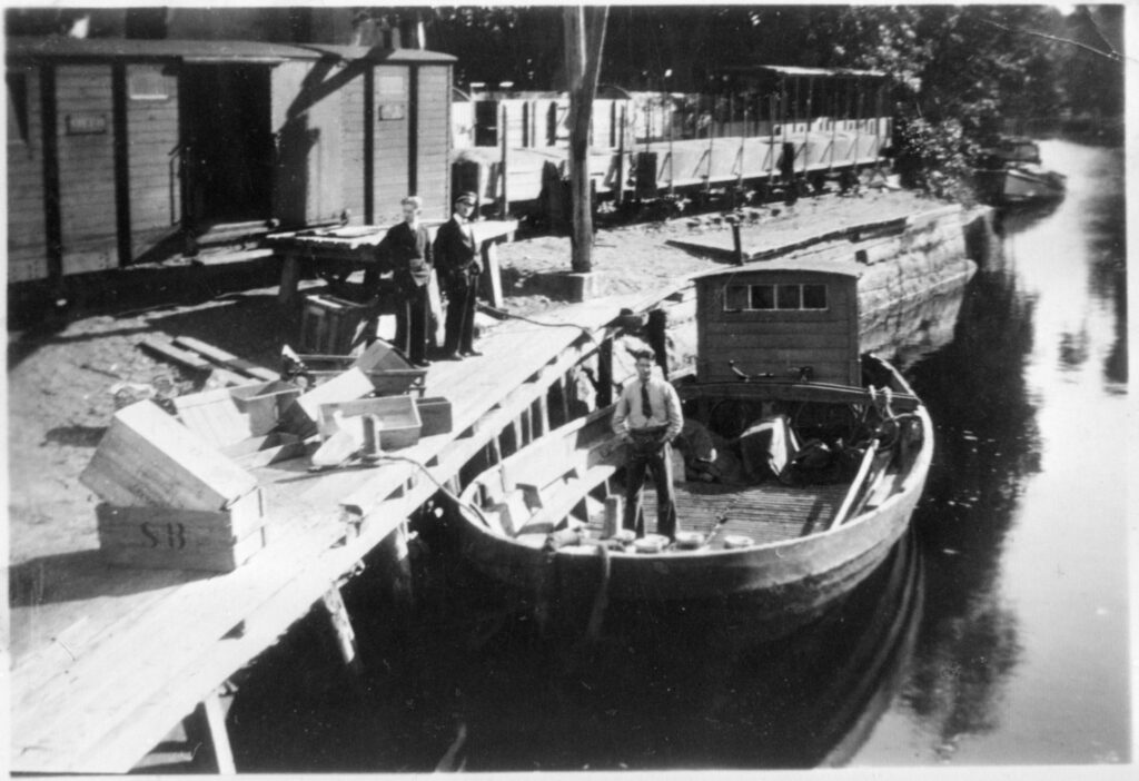 Omlastning mellan båt och tåg i Nättraby hamn.